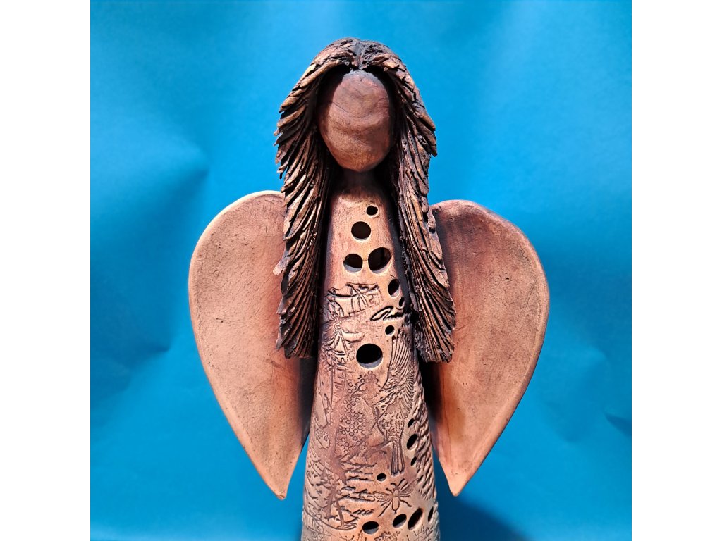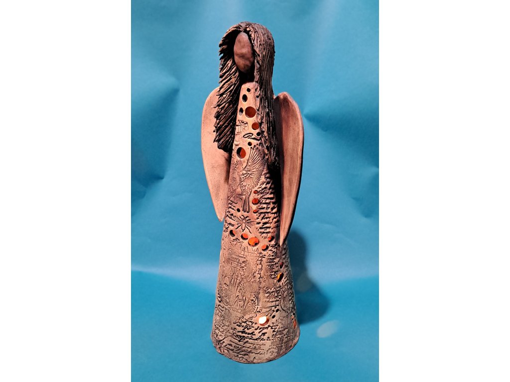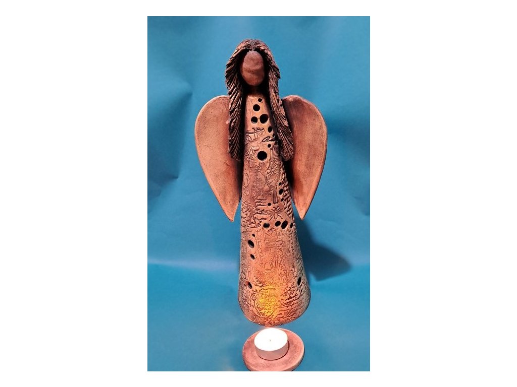 Tento keramický anděl je ručně vyrobený dekorativní svícen z keramické hlíny, opatřený glazurou. Reliéfní zpracování a jemné perforace umožňují průchod světla ze zapálené čajové svíčky.