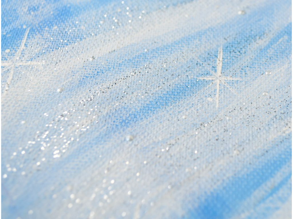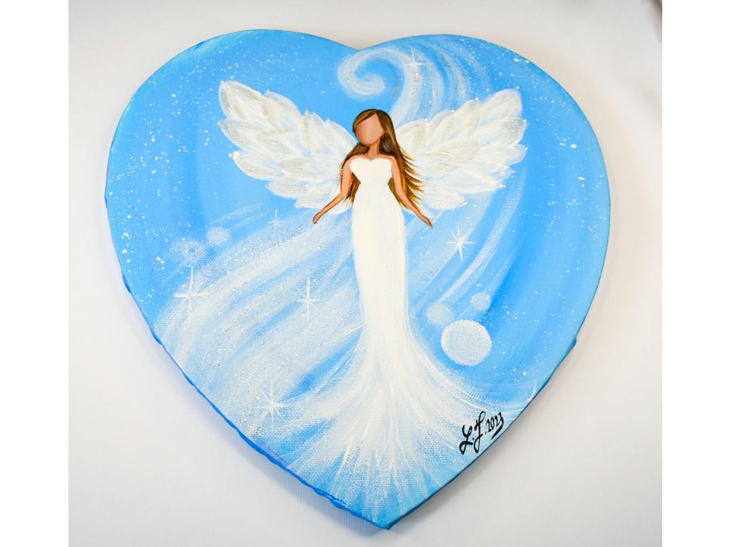 Originál obrazu anděla - akryl na plátně, modrý podklad. Tvar srdce.