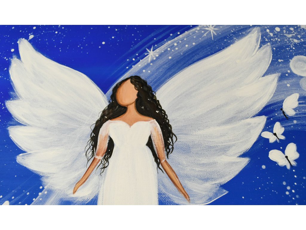 Originál obrazu anděla - akryl na plátně, tmavě modrý podklad.